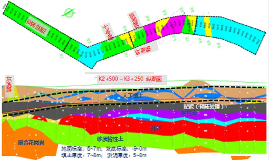 本项目道路全长约3.0km,规划为双向4~8车道,埋深最深达25m,为国内少有的长距离、大跨度地下深埋城市主干道。线路位于滨海地区,经多次人工改造,存在大量填土(石)、深厚软弱淤泥、强透水砂层等不良地质,工程条件异常复杂。道路基坑设计采用悬臂桩、双排桩、桩锚、桩撑、沉井以及放坡等多种支护方案,道路底面采用预应力管桩、旋喷桩、素砼桩、注浆钢管桩以及换填碾压等地基处理方式。上跨1、5、11号地铁线的双界河路段采用抗拔桩、抗隆起板、注浆预加固以及分块沉井开挖等专项保护措施。设计方案科学严谨,在基坑稳定性、地基承载力、地铁变形控制等方面均满足了工程要求,取得了良好的工程效果。