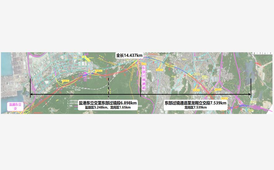 项目概况:南起盐田港东港区,北至水官高速龙岗收费站,全长14.4公里(隧道总长9公里),城市快速路标准,双向6车道,总投资约119亿元。